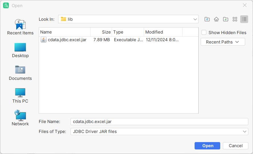 - Select the JAR file cdata.jdbc.excel.jar and click "Open".