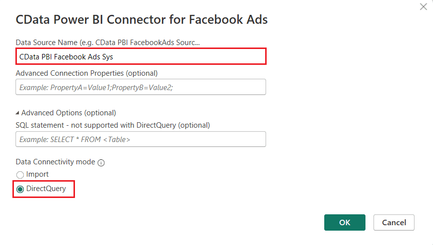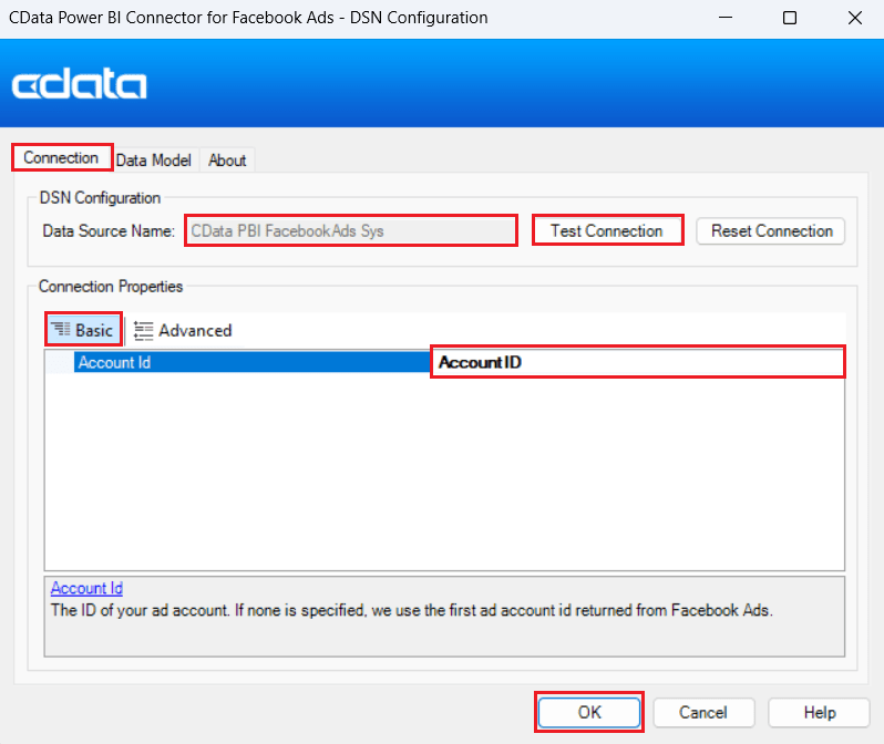 - Connect to Facebook Ads: Open the ODBC Administrator (make sure it matches the bitness of your Power BI installation: 32-bit or 64-bit). Then, configure or create a new DSN using the installed Facebook Ads connector. Enter the Facebook Account ID under Basic connection properties and click Test Connection to verify connectivity with your Facebook Ads account. Once successful, click OK to save the DSN configuration.