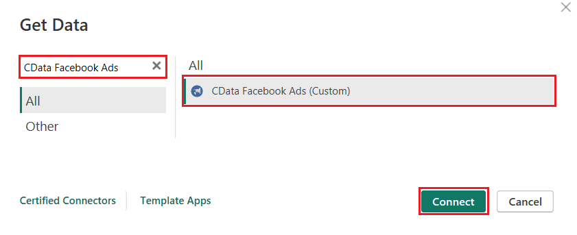 - Open Facebook Ads connection in Power BI: Launch Power BI Desktop, click Get Data, and search for CData Facebook Ads under the "All" option. Select it and click Connect.
