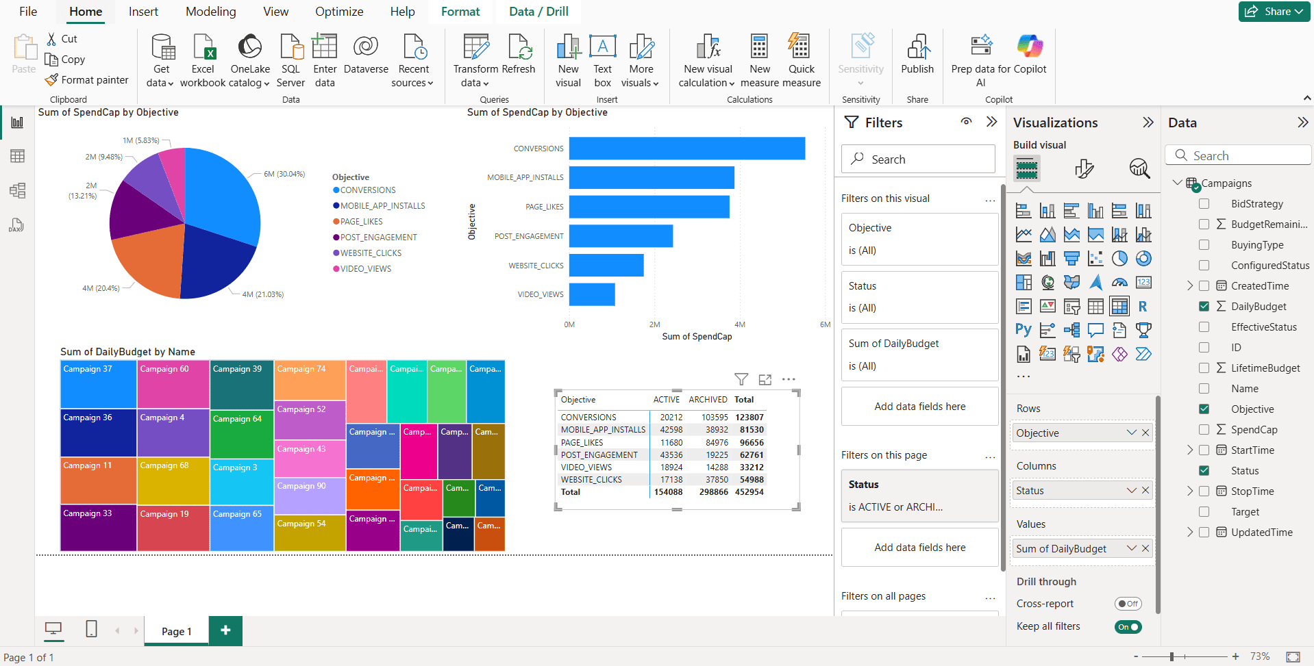 The dashboard below shows ‘Spend Capital’ by objective (pie and bar charts), ‘Daily Budget’ by campaign name (treemap), and a matrix of ‘Daily Budget’ by objective and status for a clear view of budget distribution.
