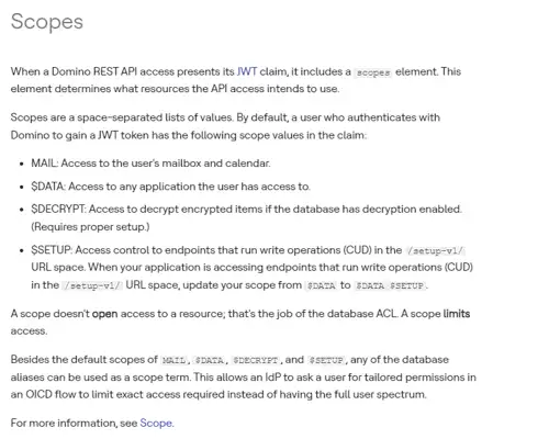 The Domino REST API also includes base scopes such as MAIL, $DATA, and $DECRYPT, which manage mail and data access permissions.