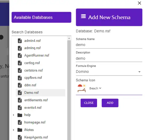 - A list of .nsf files on the connected Domino Server will be displayed. Select the application to be exposed, enter the Schema Name and Description, then click Add.