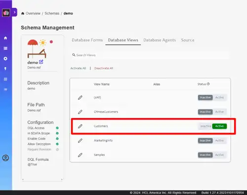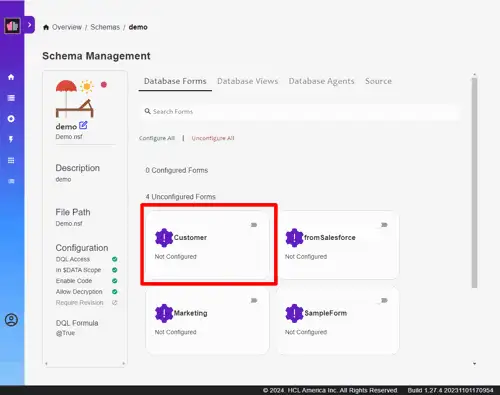 For this guide, we'll expose the Demo.nsf application, which manages customer information. This application includes forms like "Customer" and views such as "Customers" to organize and display data.