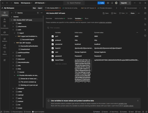 { "bearer": "xxxxxxxxxxxxxxxxx", "claims": { "iss": "HCL Project KEEP RANDOM", "sub": "CN=Kazuya Sugimoto/O=restapi", "iat": 1718177280, "exp": 1718184480, "aud": ["Domino"], "CN": "CN=Kazuya Sugimoto/O=restapi", "scope": "MAIL $DATA $DECRYPT $SETUP Domino.user.all" }, "leeway": 5, "expSeconds": 7200, "issueDate": "2024-06-12T07:28:00Z" } - Add the obtained Bearer Token to Variables in Postman. Naming it "bearerToken" will allow it to be automatically used in subsequent API requests.
