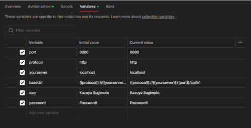 Once the Postman Collection is configured, set up the connection and login details in the Variables section. This will make it easier to reuse them in each API request later.