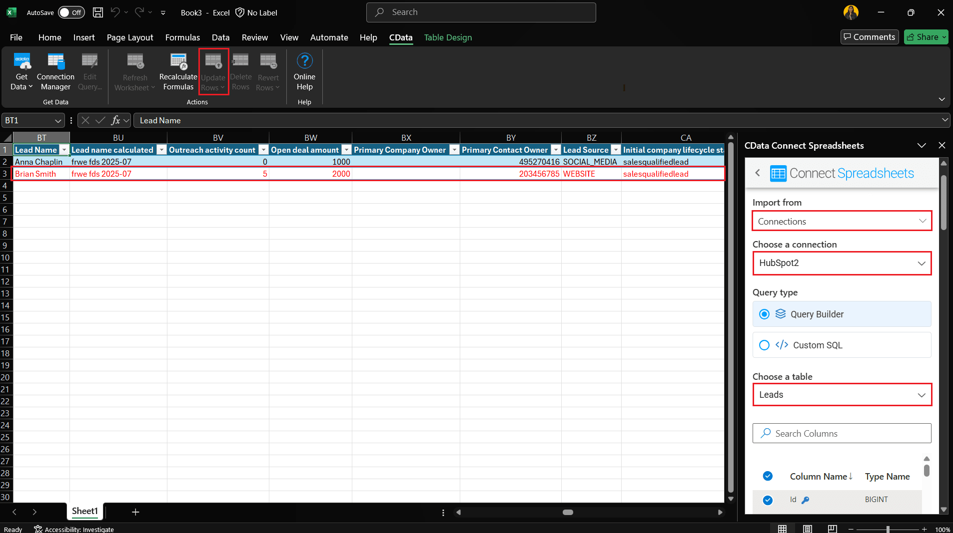 If your HubSpot plan includes access to the Leads object, you can connect to it effortlessly using the CData HubSpot Drivers and Connectors. For example, with the CData Connect Spreadsheets for HubSpot, you can view and work with Leads data directly within Excel, just like any other table. This makes it easy to explore and manage lead records without writing any code or manually querying the HubSpot API.