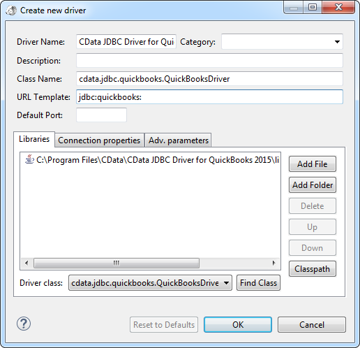 - In the create new driver dialog that appears, select the cdata.jdbc.quickbooks.jar file, located in the lib subfolder of the installation directory.