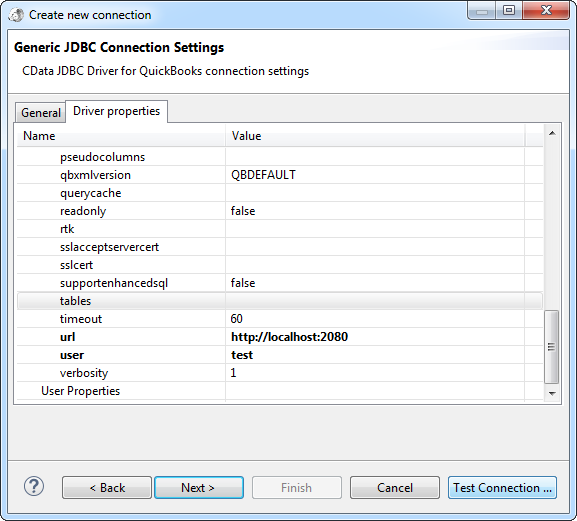 On the grid, add the different connection properties by right-clicking the grid and then clicking Add New Property. Required connection properties for QuickBooks are below:
