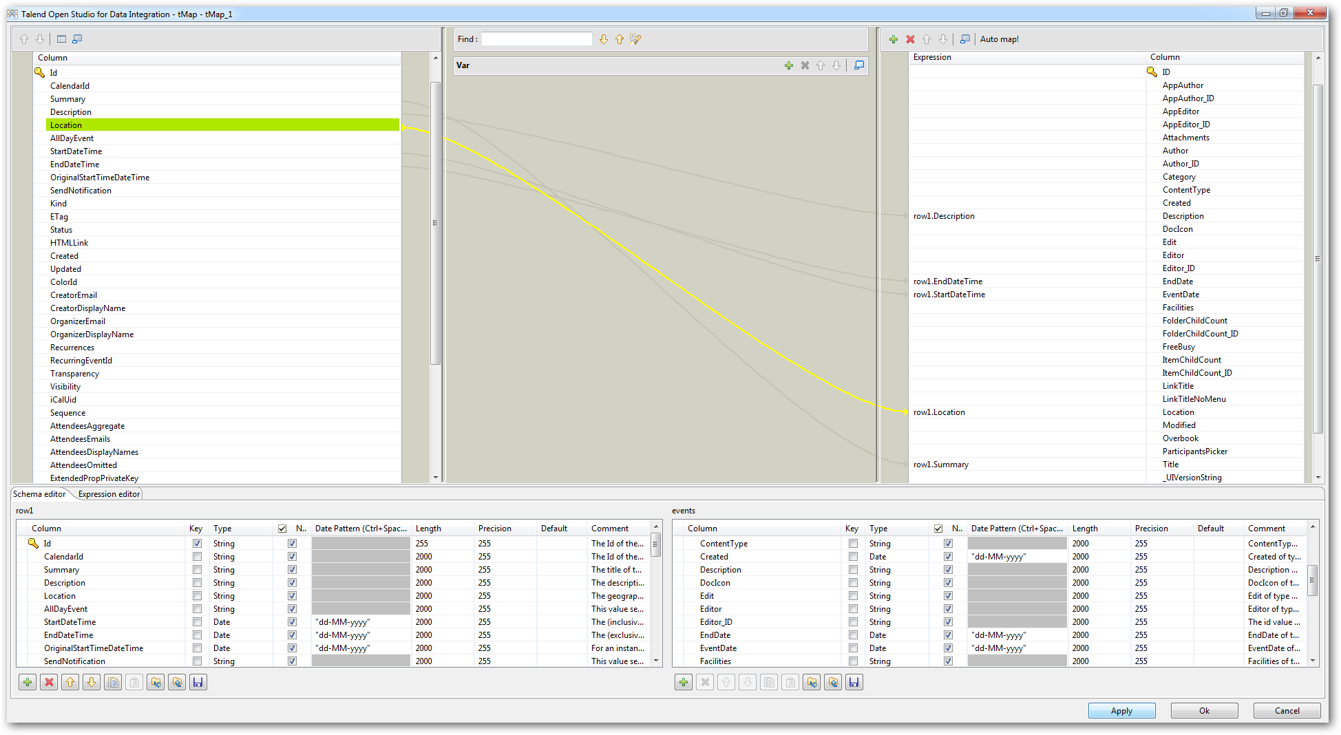 - Connect the two JDBC data sources by right-clicking each component and dragging a vector from the Google calendar to the tMap component, then from the component to the SharePoint calendar destination. Double-click the tMap component to define the column mappings. You can use the mapping below to transfer calendar events: