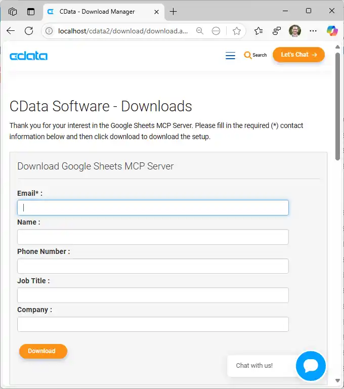 - To begin, navigate to https://www.cdata.com/solutions/mcp and download the CData MCP Server for Google Sheets (direct link).