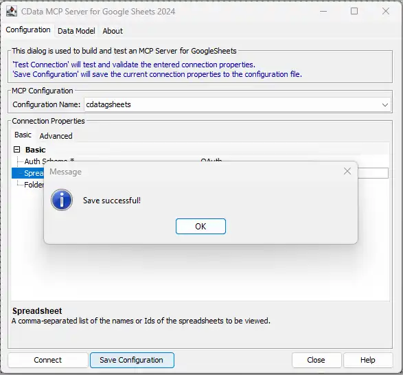 - The CData MCP Server for Google Sheets is pre-configured to authenticate directly with Google, so you should only need to set the Spreadsheet property. If you copied our sample CRM sheet, set the Spreadsheet property to "CRM Data" (or the name you used when you saved the copy). If you did NOT copy our sample CRM sheet, set the Spreadsheet property to the name of another Spreadsheet in your Google account.
