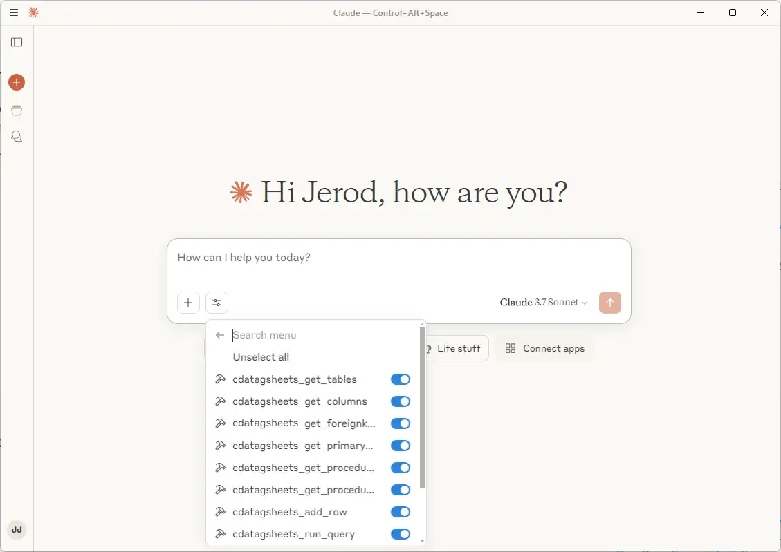 Now that we have installed the CData MCP Server and configured a connection, we are ready to start with Google Sheets data in Claude Desktop.