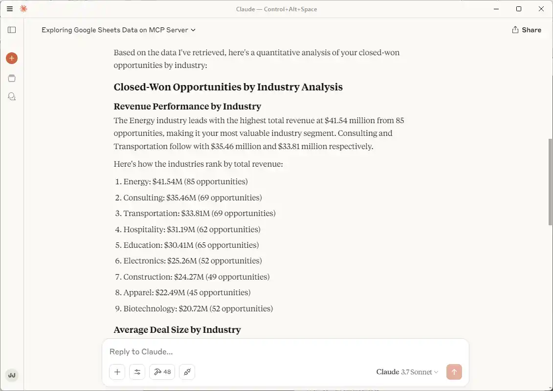 - The sample sheet contains mock CRM data consisting of a list of accounts and related opportunities. Now that you have connected, you can ask Claude questions about the data. For example: "Can you give me a quantitative analysis about my closed-won opportunities by industry?"