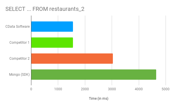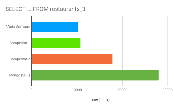 The CData Software drivers regularly prove to be faster than the competitors' equivalent products, particularly when dealing with large data sets. When the drivers are slower, the difference is barely noticeable (less than 10 milliseconds) and is the trade-off for live schema discovery that includes deeper drill-down into NoSQL data that most other providers. You can read more about our innovative practices for working with NoSQL data (like that stored in MongoDB) in or NoSQL Drivers feature comparison.