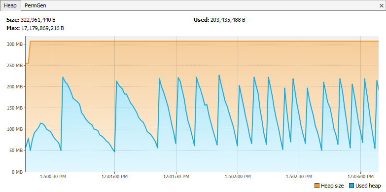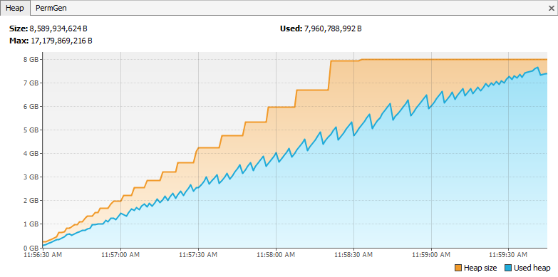 While testing the read performance of the JDBC drivers, we also measured client-side resource usage, looking specifically at memory. The charts below were found by running a sample Java program and using Java VisualVM to capture the memory usage. We used Java OpenJDK version 12.0.2 with a maximum heap size of 8 Gigabytes.