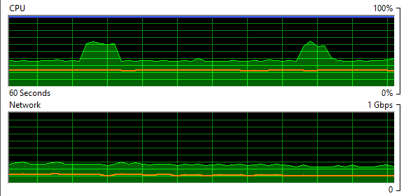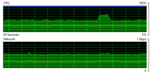 While testing the read performance of the ODBC drivers, we also measured client-side resource usage, looking specifically at processing capacity and network bandwidth. The charts below were found by executing the simple C++ application and using the Windows Resource Monitor.