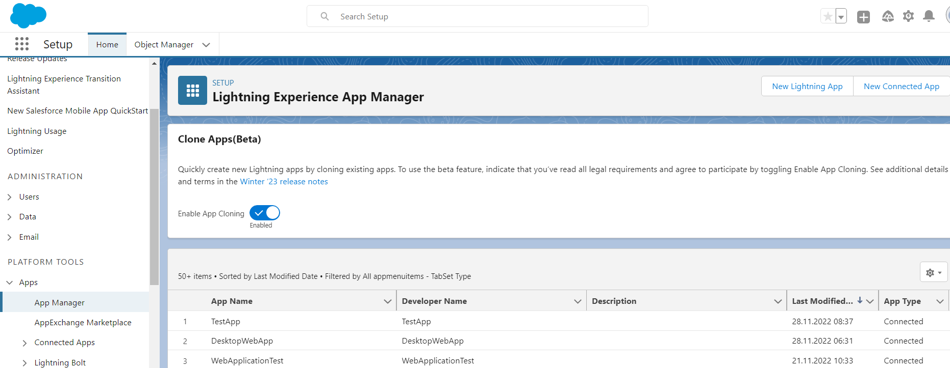 - Enter "Apps" in the Quick Find box, go to "App Manager" from the dropdown and then click on "New Connected App" the link to create an application