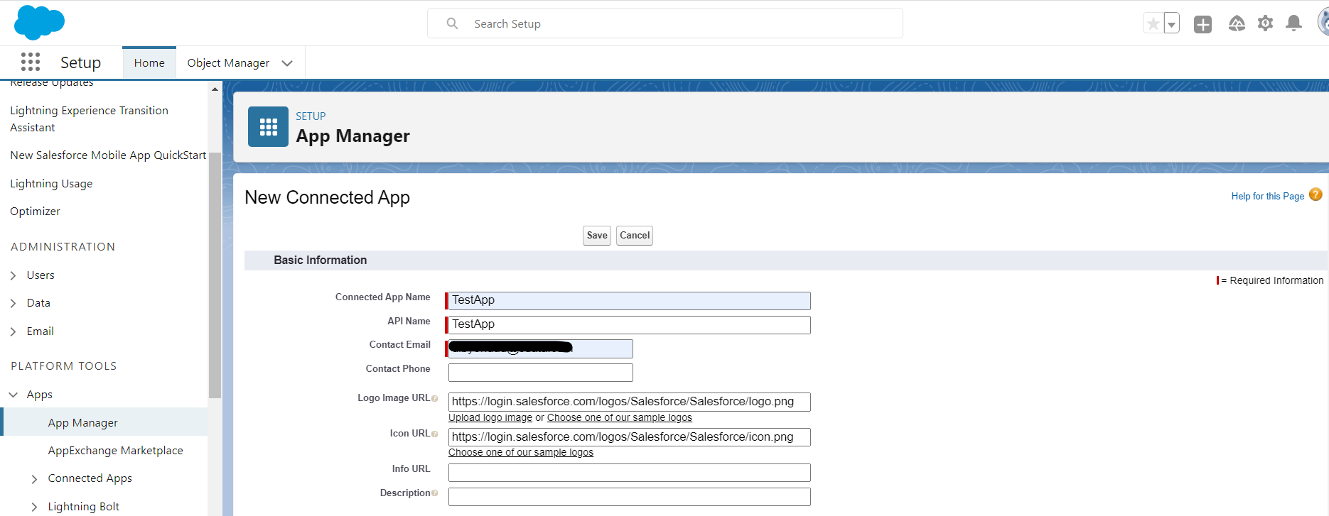 - In the New Connected App section, enter "Connected App Name", "API Name", "Contact Email"