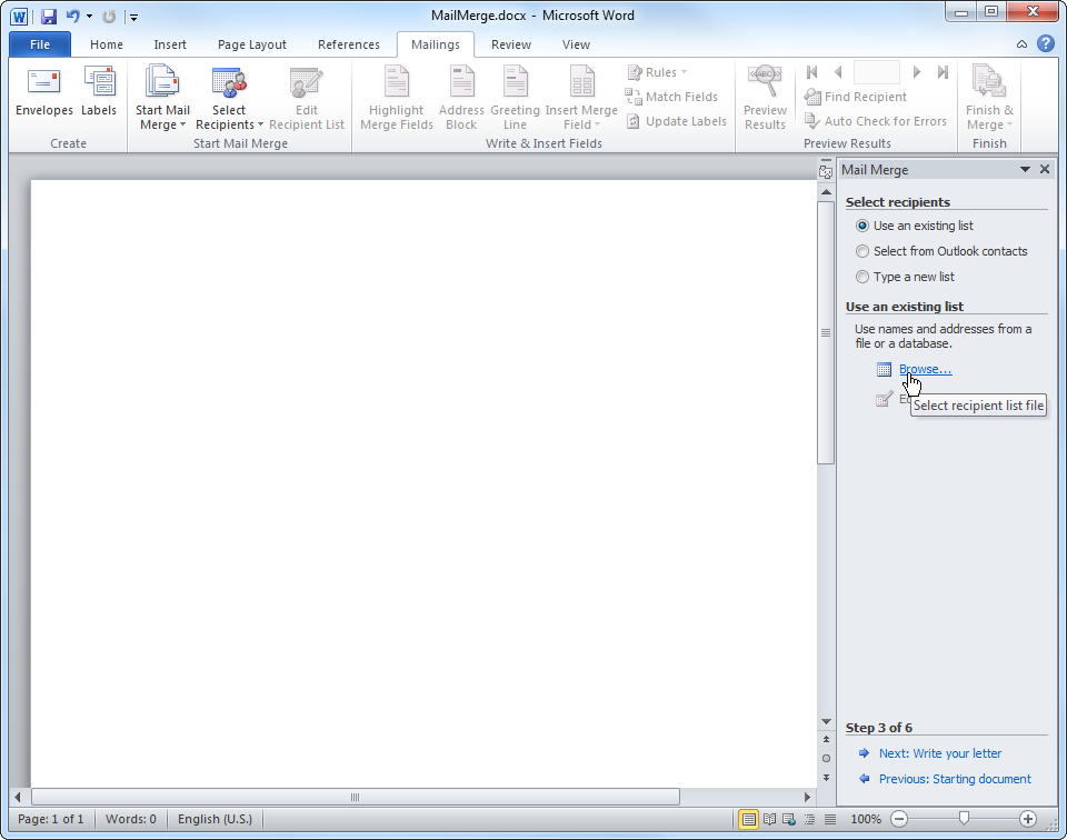 - Click Next and choose whether you want to start from a template, a blank document, or an existing document. This example starts from a blank document. Finally click Next to choose your recipients.