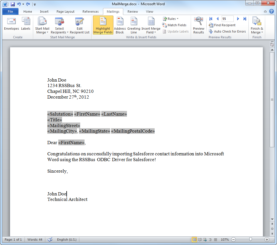 This article will show you how to use the CData ODBC Driver for Salesforce with Microsoft Word's Mail Merge feature to easily create templated letters for all your Salesforce contacts. Although this article uses the driver for Salesforce as an example, the same process can be used with any CData ODBC drivers.