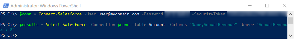 $results = Select-Salesforce -Connection $conn -Table Account -Columns "Name,AnnualRevenue" -Where "AnnualRevenue > 0"