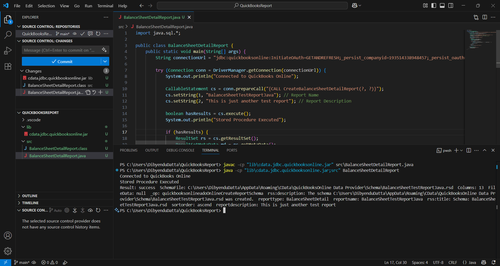 Using Java and SQL, developers can easily trigger procedures like CreateBalanceSheetDetailReport to retrieve detailed financial data directly from their QuickBooks Online accounts, all within the VS Code terminal.