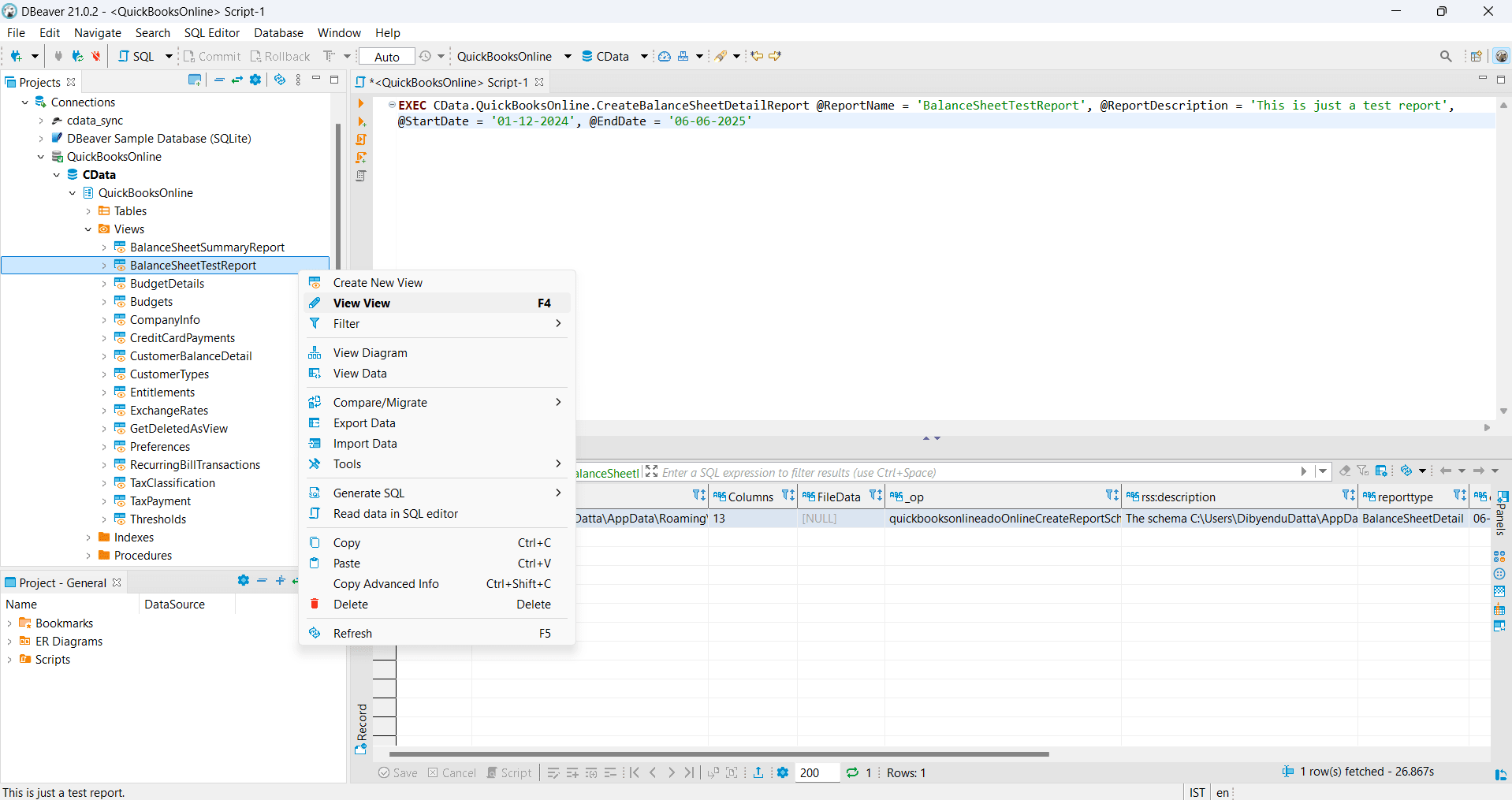 In this article, we explore two different ways to connect to QuickBooks Online using the CData QuickBooks Online JDBC driver and execute the CreateBalanceSheetDetailReport stored procedure using both DBeaver and Visual Studio Code (VS Code).