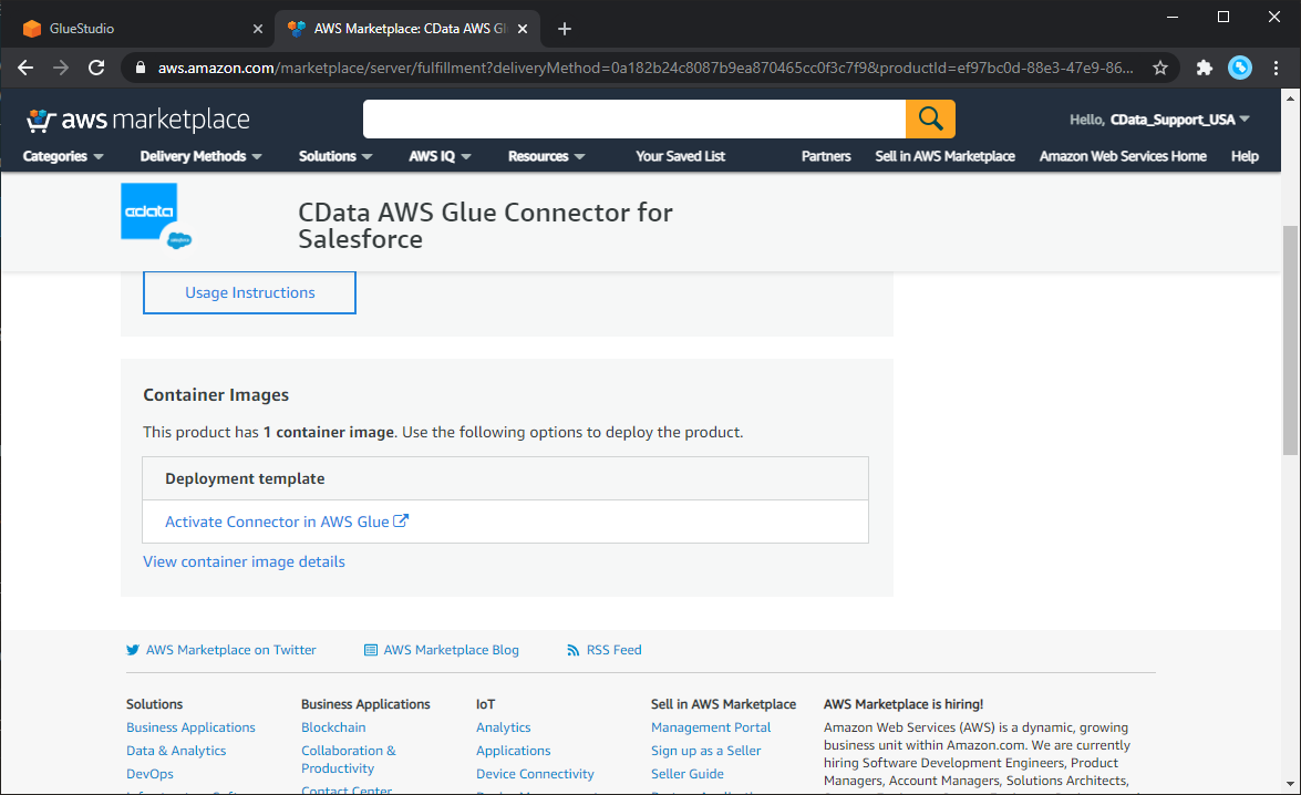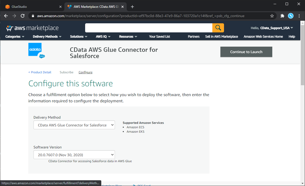 To work with the CData Glue Connector for Salesforce in AWS Glue Studio, you need to subscribe to the Connector from the AWS Marketplace. If you have already subscribed to the CData Glue Connector for Salesforce, you can jump to the next section.
