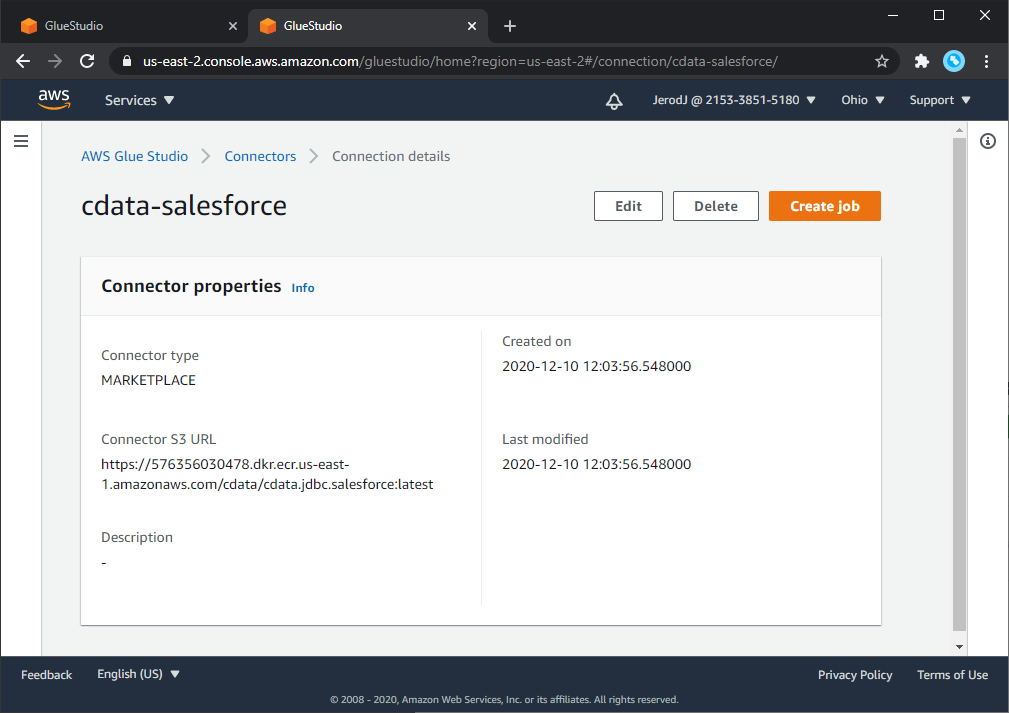 There are no external operating system, database type, or storage requirements for using the CData AWS Glue Connector for Salesforce. Customers will need familiarity with AWS Glue, AWS Glue Studio, and Python/Apache Spark to best utilize the Glue Connector for Salesforce. Customers will need an AWS account and a subscription to the AWS Glue Connector. AWS Glue and Glue Studio jobs run on Amazon EC2 instances; the CData AWS Glue Connector is a container image that runs on Amazon ECS; and the sample Glue job in this walkthrough stores data in Amazon S3.