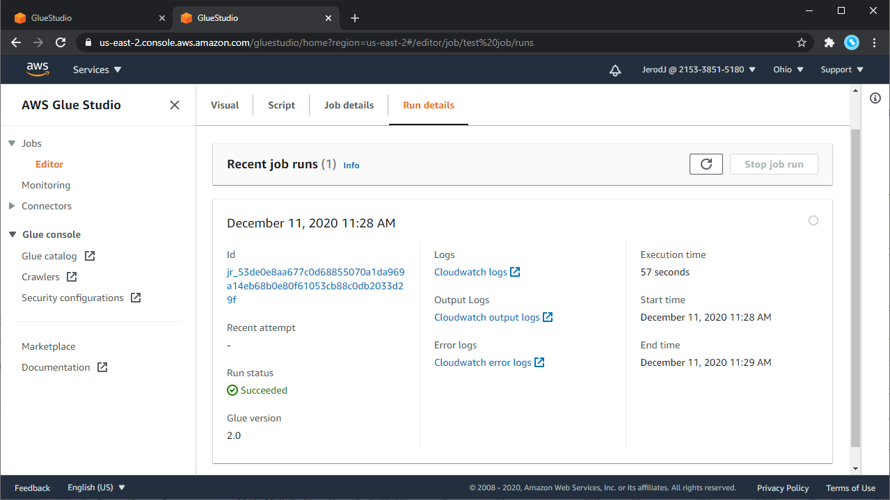 - To view the generated script for the job, choose the "Script" tab at the top of the visual editor. The "Job runs" tab shows the job run history for the job. For more information about job run details, see "View information for recent job runs."