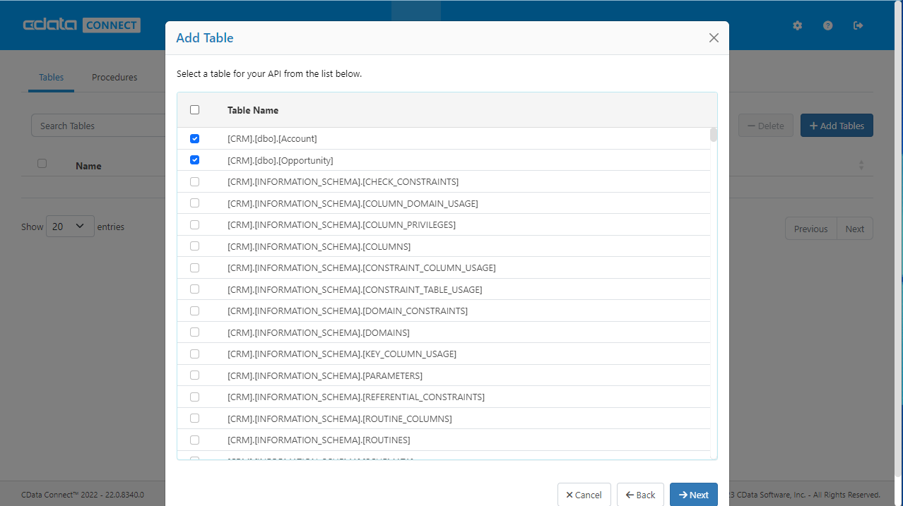 - Click OData -> Tables -> Add Tables