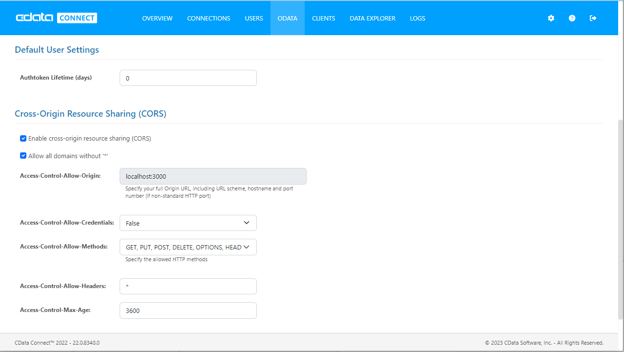 When accessing and connecting to multiple different domains from an application such as Ajax, there is a possibility of violating the limitations of cross-site scripting. In that case, configure the CORS settings in OData -> Settings.