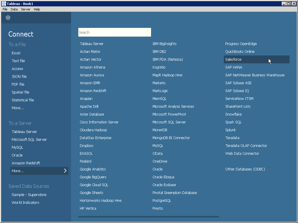 - Choose to connect to a server and select Salesforce.