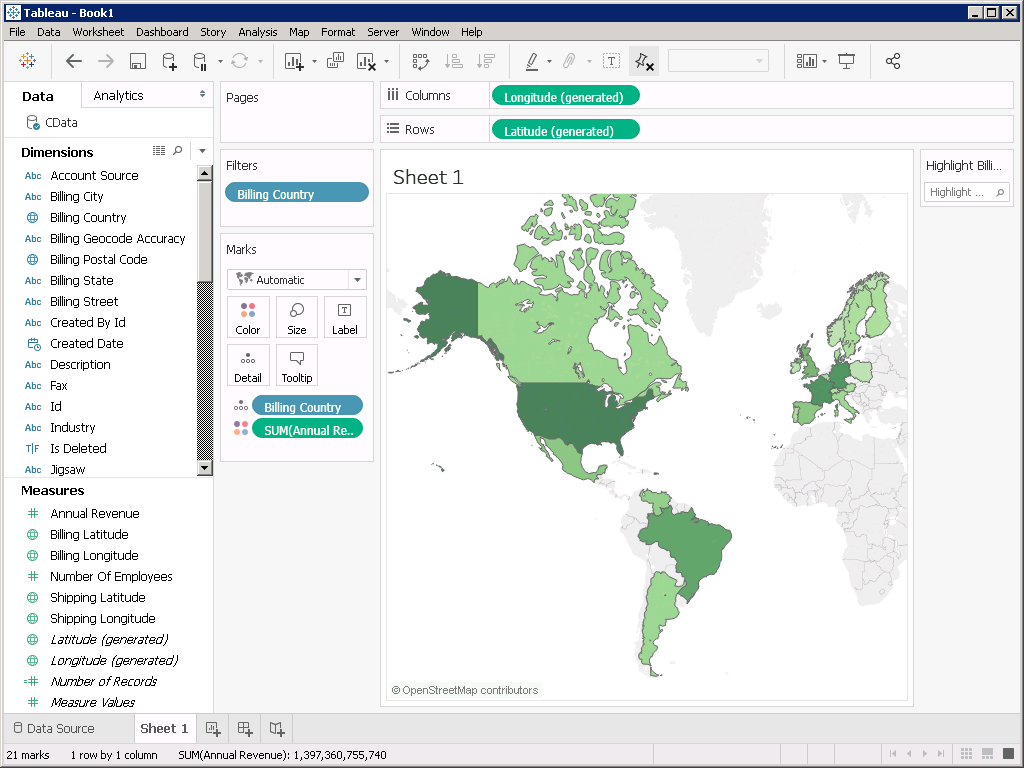 To build the chart pictured below (the sum of account annual revenue by country) using the native support, you are required to wait for Tableau to extract and process data from all 40+ dimensions and measures for each row of data before you can begin building the chart. On the other hand, the CData ODBC Driver sends a request for only the data you are working with to Salesforce, including the summation of the annual revenue by country. The precise query means that you only have to wait for a minimal amount of data to be returned and that you can rely on the processing power of Salesforce to aggregate your data. And, because the connection is live, the data will be updated on-the-fly whenever the report is updated or refreshed.