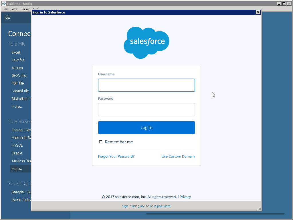 - Enter your username and password to authorize Tableau to connect to your Salesforce data. Tableau requires users to authenticate with each new connection to Salesforce.