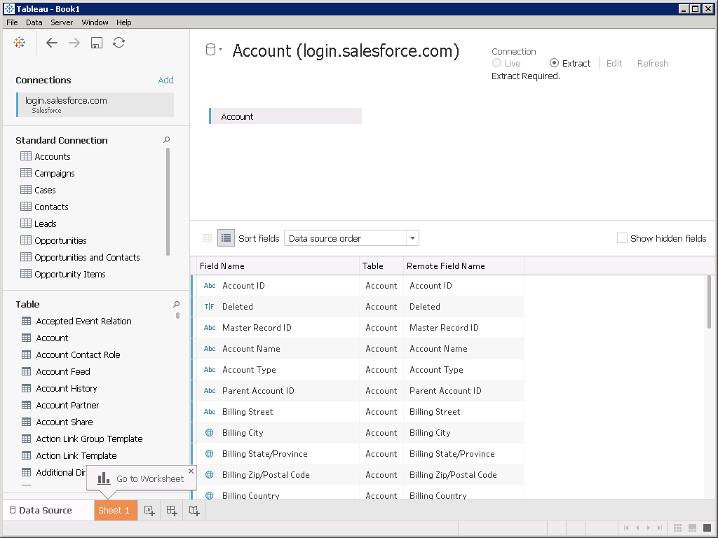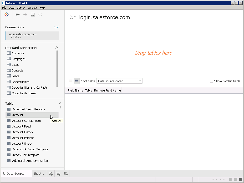- Click Sheet 1 to begin working with your Salesforce data in Tableau. In our tests, this process took approximately twelve seconds (the accumulated time for Tableau to determine the available features of the ODBC driver and the Account table metadata).