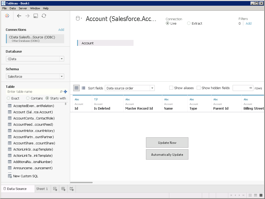 - Drag the Account table to the dashboard. The CData ODBC Driver supports both Live and Extract connections. With Live connections, reports and dashboards can be dynamically refreshed to include the most recent Salesforce data.