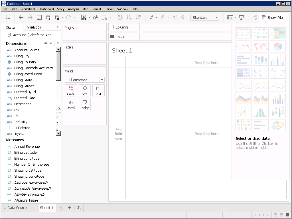 - Click Sheet 1 to connect to and begin working with your Salesforce data in Tableau. In our tests, this process took approximately two minutes and twenty-four seconds to complete (Tableau imports all data from the Account table before opening the sheet).