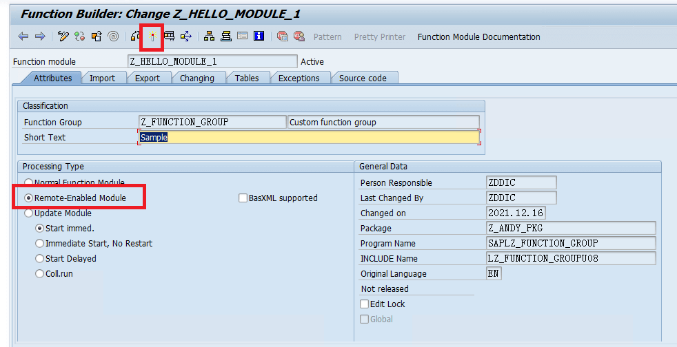In the "Attributes" tab, check "Remote-Enabled Module" to enable this generic module as an RFC, save, and then activate it.