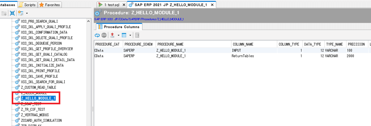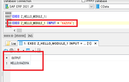 Execute the SQL command "EXEC Z_HELLO_MODULE_1 INPUT = 'KAZUYA';" to get the result as shown below!