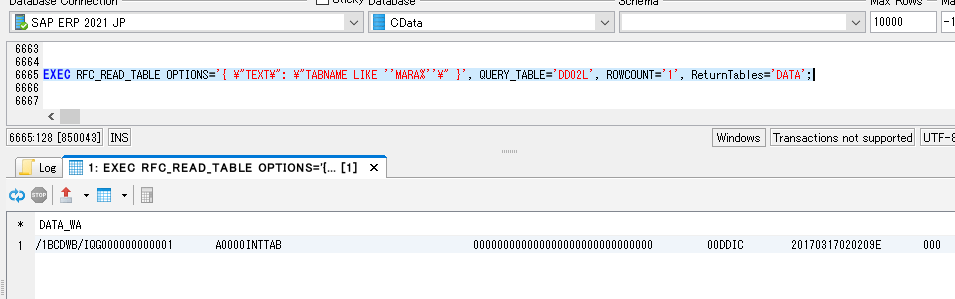 EXEC RFC_READ_TABLE OPTIONS='{ \"TEXT\": \"TABNAME LIKE ''MARA%''\" }', QUERY_TABLE='DD02L', ROWCOUNT='1', ReturnTables='DATA';