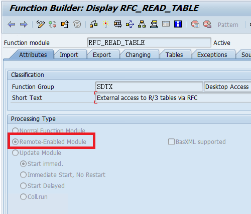 One key point in executing this generic module is whether it is defined as an "RFC" (Remote Function Call). The "RFC_READ_TABLE" is defined as a Remote-Enabled Module, allowing it to be called externally through the CData SAP ERP Driver.