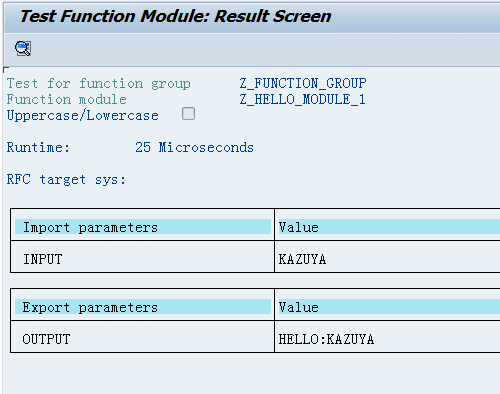 The generic module we will create is called "Z_HELLO_MODULE_1". It is a simple echo-type generic module that returns a string like "HELLO:{INPUT}" based on the input value. For example, if you pass the import parameter "INPUT" with the value "KAZUYA", it will return "HELLO:KAZUYA" in the export parameter "OUTPUT".