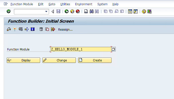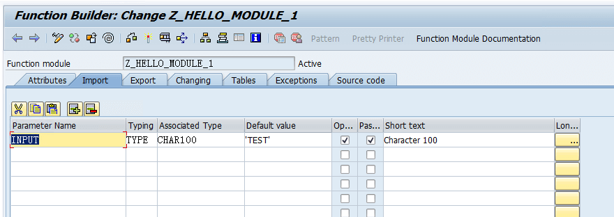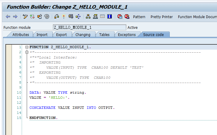 FUNCTION Z_HELLO_MODULE_1. *"---------------------------------------------------------------------- *"*"Local Interface: *" IMPORTING *" VALUE(INPUT) TYPE CHAR100 DEFAULT 'TEST' *" EXPORTING *" VALUE(OUTPUT) TYPE CHAR100 *"---------------------------------------------------------------------- DATA: VALUE TYPE string. VALUE = 'HELLO:'. CONCATENATE VALUE INPUT INTO OUTPUT. ENDFUNCTION.