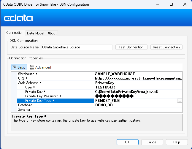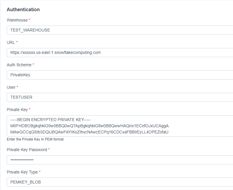 jdbc:cdata:snowflake:url=https://xxxxxx.us-east-1.snowflakecomputing.com; Warehouse=TEST_WAREHOUSE; User=TESTUSER;AuthScheme=PrivateKey; PrivateKey="C:\SnowflakePrivateKey\rsa_key.p8"; PrivateKeyType=PEMKEY_FILE; PrivateKeyPassword="*****";