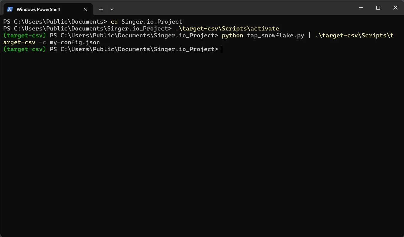 python tap_snowflake.py | .\target-csv\Scripts\target-csv -c my-config.json