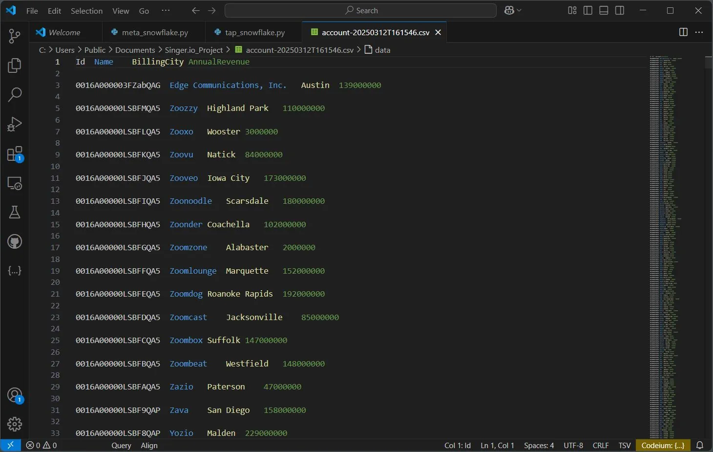 In this article, we'll build a Tap for Snowflake using a CData connector with Singer.io in Python, then move the data from Snowflake to the Singer.io CSV target target-csv. We'll use a Free Community License for the CData Python Connector for Snowflake along with VSCode. We'll also explore how to dynamically retrieve schema and metadata using CData's sys_tables system tables to simplify data extraction and improve pipeline efficiency.