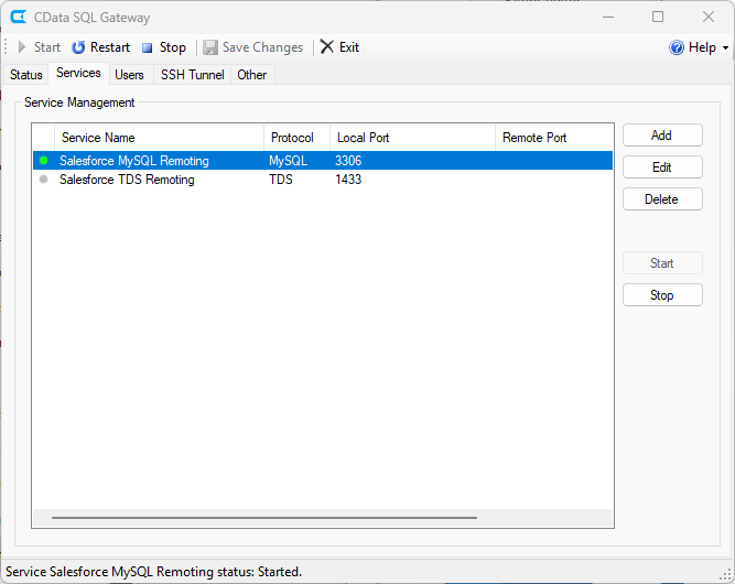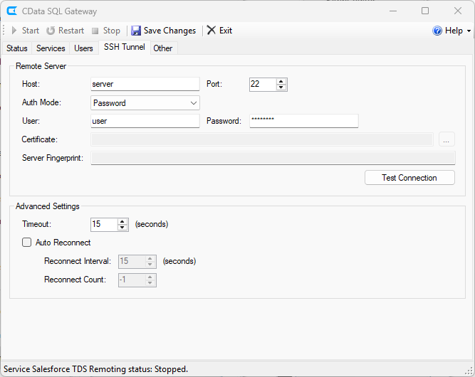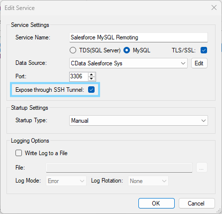 - Click the box to expose the service on the SSH Tunnel. The SQL Gateway will automatically assign a remote port for connecting to the service through the SSH host.