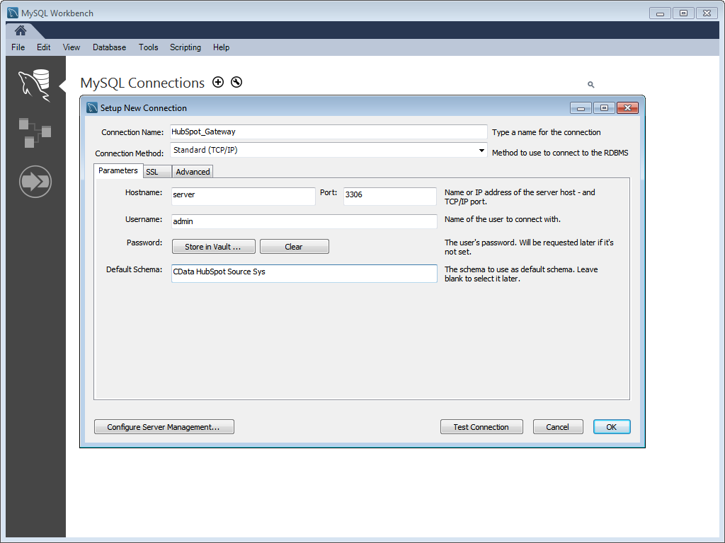 With the SSH Tunnel configured, you can now connect to the ODBC data sources exposed by the SQL Gateway through the SSH Tunnel. To do so, simply send requests from a client to the SSH host, specifying the port to be used for forwarding. In this article, we are using MySQL Workbench to connect to the data, but you will be able to connect using any BI, reporting, or ETL tool that can communicate with a SQL Server or MySQL database. Any requests sent by tools to the SSH server and port are forwarded to the SQL Gateway, which then requests the data from the ODBC data source and returns the data through the tunnel to the client.