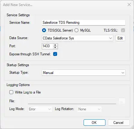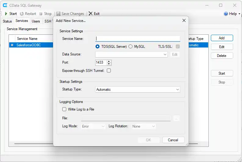 The SQL Gateway connects through System DSNs for ODBC drivers, so you will need Administrator access to create new remoting services. The steps to create a new service are below.